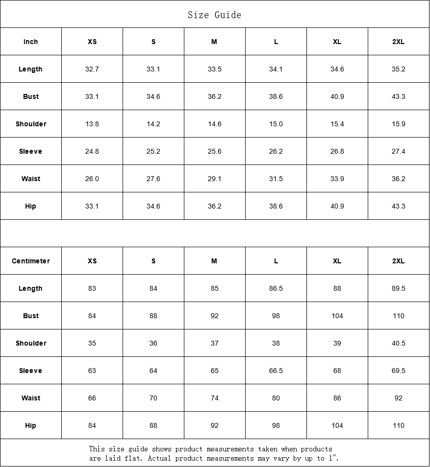 This size guide shows product measurements taken when products are laid flat. Actual product measurements may vary by up to 1".